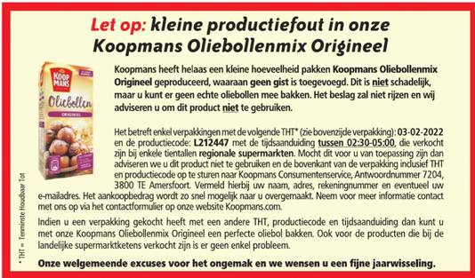 Er zijn namelijk pakken oliebollenmix in omloop zonder gist. Het bedrijf liet gisteren weten dat er een aantal oliebollenmixen in omloop zijn die geen gist bevatten. Koopmans adviseert consumenten het product niet te gebruiken.
